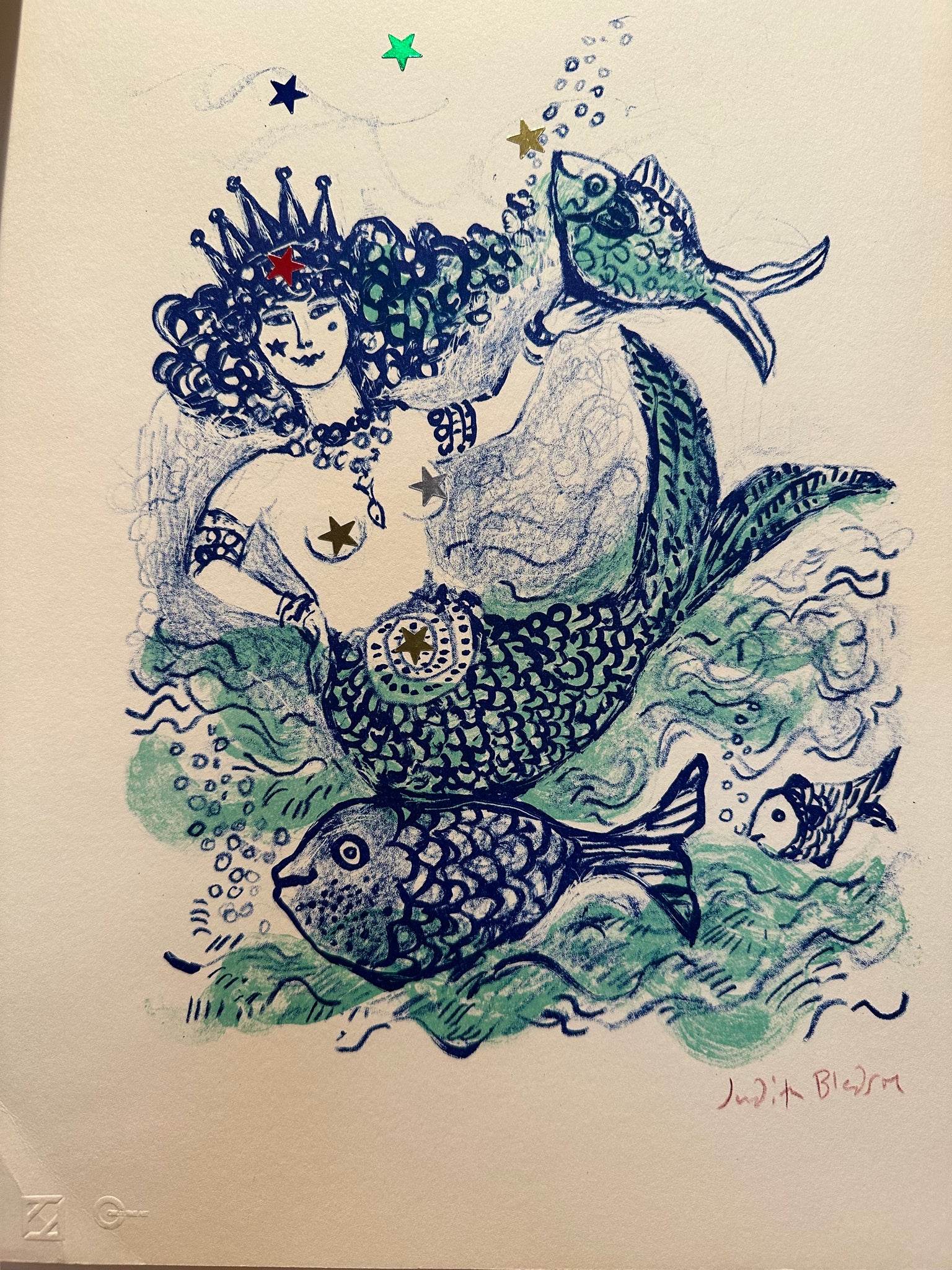 In a shimmering sea of blues and greens, a graceful mermaid queen floats among playful fish and twinkling stars, her serene gaze capturing a world both mystical and serene. Filled with color, whimsy, and quiet elegance, this piece reflects Judith Bledsoe’s gift for blending myth, beauty, and storytelling into art that enchants and endures.
